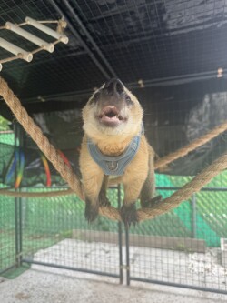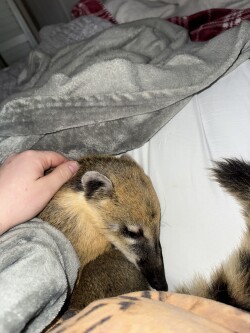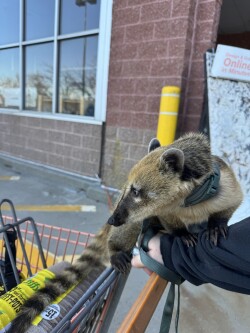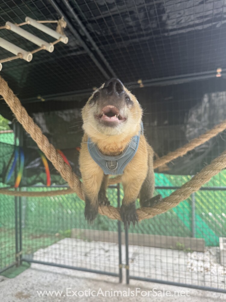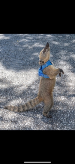 1.5 year old male coati. He is extremely friendly. Loves kids and other animals. He walks on a leash. He lives outdoors in his enclosure which is included in his rehoming fee. He also comes inside and loves to lay on your lap for a lazy tv day. He goes everywhere with me when I go to stores , events ,and kayaking.