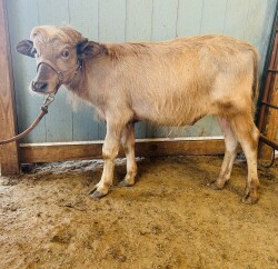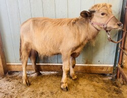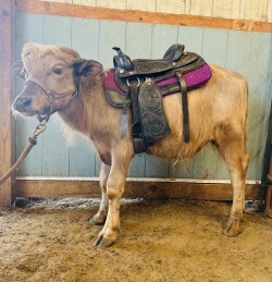 Donnie is a yearling Water Buffalo Bull. Rare in color, he is a blond. He was a bottle baby and used for events. Halter broke. Loves kids. The kids were going to break him to ride but started a different project. Loads well, can put a saddle on him. Sweet and super lovable.