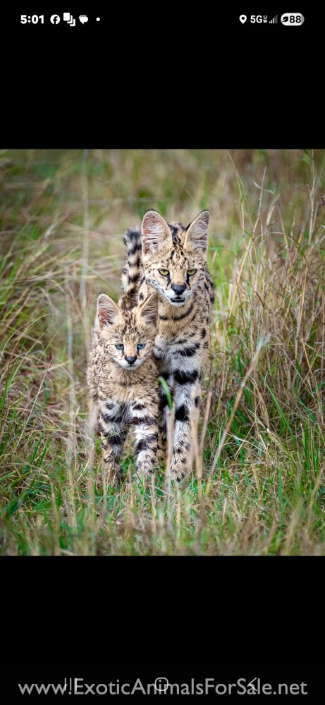 Serval kittens, one male one female. Call me if you’re interested so I can weed out the scammers. USDA facility